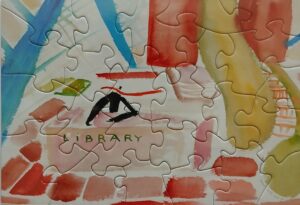 In 2012, during my first Seekonk, Massachusetts winter, while carless and recovering from physical injury, I fell in love—with jigsaw puzzles! No batteries required and totally silent, this old-fashioned mode of re-creation/creation simultaneously occupied my active fingers and soothed my anxious mind. Some months later, when healed and functioning, I finished a totally surprising new painting called “This Is a Life Worth Living.” This painting actually pleased me, as well as friends and strangers alike. As an experiment, I decided to transform this image into a puzzle…